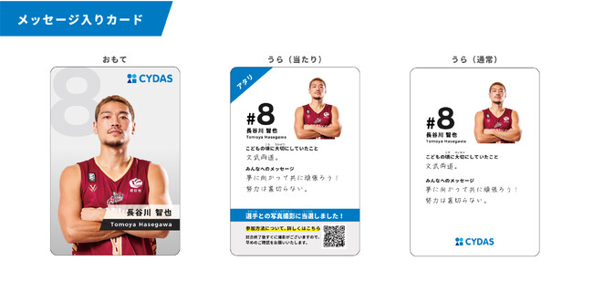 会場にいらっしゃるお子様には、越谷アルファーズのメンバーからのメッセージカード付きのお菓子の詰め合わせBoxをプレゼントいたします。コドモ心をくすぐるトレーディングカード風のデザインのカードの裏面には、各メンバーの「コドモの頃に大切にしていたこと」と「みんなへのメッセージ」が。