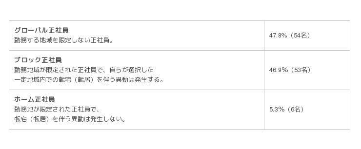 なお当社では多様な働き方を実現するため、2017年度の新卒採用より自らが選択した一定地域内での勤務が可能な「ブロック正社員」(勤務地域限定社員)が選択可能となっており、本日入社した113名の新入社員のうち46.9%がブロック正社員です。また高卒者は全員「ホーム正社員」としての採用で、入社1年目は原則、実家からの勤務となります。(2年目以降は本人の希望により、グローバルやブロック正社員への区分変更が可能)