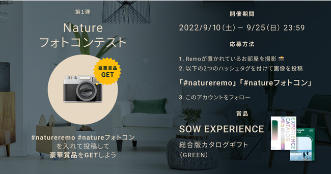 「自然との共生をドライブする」をミッションに掲げるNature株式会社(代表取締役:塩出 晴海 所在地:神奈川県横浜市、以下「Nature」)は、累計販売台数45万台を超えるスマートリモコン「Nature Remo」シリーズ及び次世代HEMSシステム「Nature Remo E」シリーズをご愛用頂いているみなさまを対象に、「第1弾 Natureフォトコンテスト」を、2022年9月10日(土)から2022年9月25日(日)23:59まで、Instagramで開催しています。応募頂いた中から入賞した4名様に、SOW EXPERIENCE【総合版カタログギフト(GREEN)】を賞品としてプレゼントいたします。