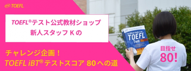 TOEFL(R)テスト公式教材ショップはTOEFL(R)テスト日本事務局として活動をしている一般社団法人 CIEE国際教育交換協議会が運営するオンラインショップです。このたび、TOEFL(R)テスト受験者に向けて、TOEFLテスト公式教材を利用した対策のご提案として、TOEFL(R)テスト公式教材ショップの新人スタッフがTOEFL iBT(R)テストスコア80を目指すチャレンジ企画を行います。