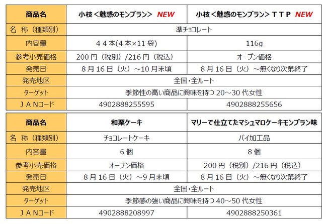 森永製菓株式会社(東京都港区芝、代表取締役社長・太田 栄二郎)は、秋の味わいを楽しめる「小枝<魅惑のモンブラン>」、「和栗ケーキ」、「マリーで仕立てたマシュマロケーキモンブラン味」を8月16日(火)から期間限定で発売いたします。