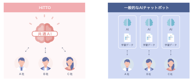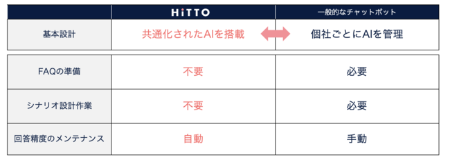 HiTTOの最大の特長は、社内DXに特化したAIチャットボットであることです。HiTTOは、日本中のバックオフィス部門のナレッジを体系化した1,000件以上の回答データベースと従業員からバックオフィスに届く一般的な質問パターンを100万件以上学習した共通AIを搭載しています。これにより、導入企業様は一般的なAIチャットボットの運用で必要となる、FAQデータの作成やシナリオ設計、回答精度を維持するためのAIのチューニングなど、個別で一から学習データを作成することなく、高精度なAIチャットボットをご利用いただくことができます。
