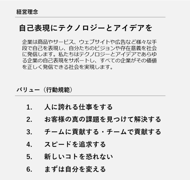 企業は商品やサービス、ウェブサイトや広告など様々な手段で自己を表現し、自分たちのビジョンや存在意義を社会に発信します。私たちはテクノロジーとアイデアであらゆる企業の自己表現をサポートし、すべての企業がその価値を正しく発信できる社会を実現します。