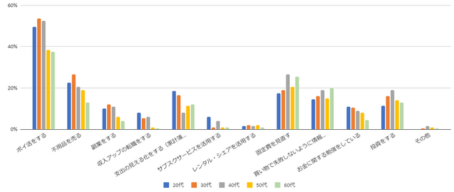 貯金を増やすために(お金を有意義に利用するため)におこなっていること(世代別比較)
