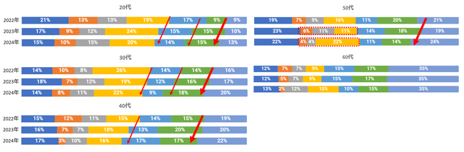 ・ 50代、60代は「100-300万円」が増加。特に「貯金できない層」と「貯金できる層」の二極化が昨年進んでいた50代は「10万円~100万円」が17%→8%と11pt著しく減少。その減少分が「100万円-300万円」の増加につながっており、23-24年の1年間で100万円未満の貯金額の層が貯金を意識して貯めた傾向にあったことが伺える。