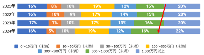 ・ 20代、30代は「500万円以上/1000万円以上」が3年連続で10pt増加。