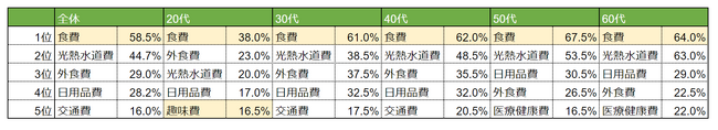 毎月の支出額が増えた項目として「食費」が30代~60代でトップ。
