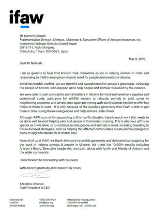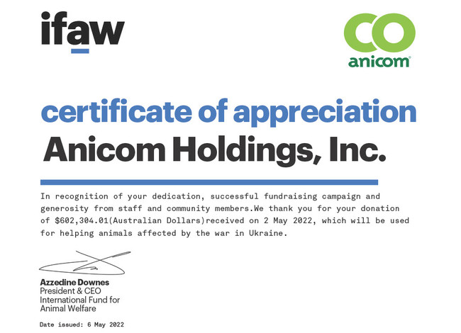 アニコム ホールディングス株式会社(代表取締役 小森 伸昭、以下 当社)は、「ウクライナのペット救援募金」プロジェクト(2022年3月17日~4月18日)を通じて、皆さまから募金いただいた寄付金と、アニコムグループからの1,000万円、またアニコム社員からの寄付とあわせて、合計56,470,488円を2022年5月2日にIFAW(国際動物福祉基金)へ寄付いたしました。
