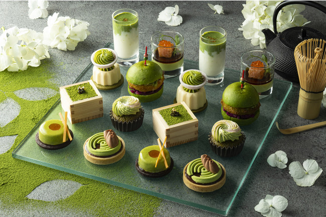 ・抹茶ラテ/キャラメルチョコレートと抹茶ムースのタルト/抹茶とアプリコットのムース/マンゴーとパッションのムース 抹茶のガナッシュ/抹茶のカップケーキ/豆乳と抹茶のババロア 炙りスモークサーモン/蟹とスクランブルエッグ 抹茶ティラミス仕立て/鶏肉とポテトの抹茶クリームスライダー/チキンリエットの抹茶クレープロール(デラックスアフタヌーンティーにて提供)