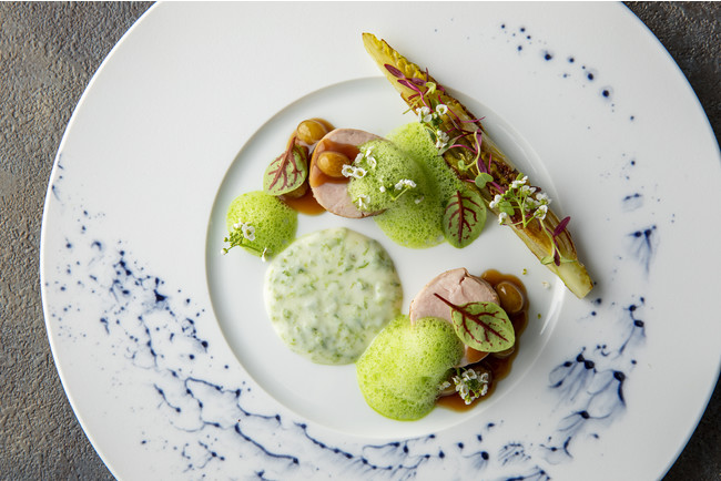 新たにシェフに就任した影山拓磨が、食材の組み合わせとさまざまな調理法を駆使し、素材の持ち味を最大限に生かした、新しい発見と驚きに満ちたメニューをお届けします。旬の和の食材を積極的に取り入れた季節限定のコースディナーは、プレゼンテーションからも日本の季節を感じられるメニューとなっています。五島海域の豊かな海原で獲れた旬の鯵を使ったマリネをグリーンガスパチョとともに、旨味が凝縮した肉厚の鮎の一夜干しはリゾットで、そしてアグー豚は青のりのソースでお召し上がりください。デザートにはエキゾチックフルーツのムースにココナッツとディルを添えてご提供します。