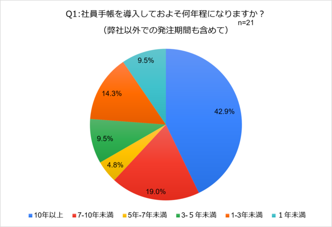・社員手帳を導入している期間は10年以上が42.9%だが1年未満、1-3年未満合計で23.8%と新しく導入する企業も