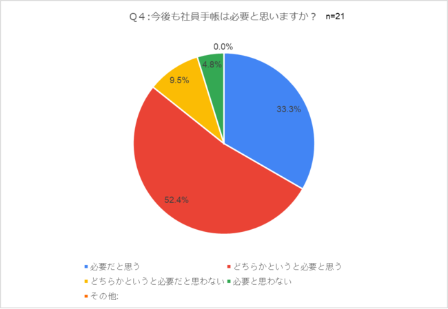 今後も社員手帳は必要ですかという質問に対して「必要だと思う」が33.3%、「どちらかというと必要だと思う」が52.4%と全体の85.7%となりました。(図4)