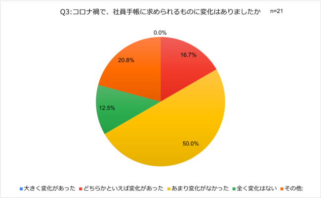 コロナ禍で社員手帳に求められる役割に変化があったかという問に対しては「あまり変化がなかった」が50.0%、「全く変化がなかった」が12.5%となり、全体の62.5%がコロナ禍によって社員手帳が果たす役割に変化がなかったという回答となりました。