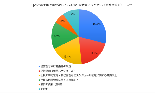 社員手帳で重要視している部分は「経営理念や行動指針の浸透」が29.0%、ついで「経営計画(年間スケジュール)」「社員の時間管理・自己管理などスケジュール管理に関する意識向上」が19.4%となりました。(図2)