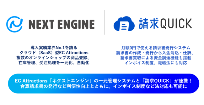 EC事業者向けクラウド(SaaS)型 EC Attractions「ネクストエンジン」を中核に、すべてのコマースを支えることを目指すNEと、クラウド型請求書発行システム「請求QUICK」を通じて受発注処理を含む企業向け請求書発行で経理の課題解決を目指す当社は、パートナー契約を通じて連携しEC事業者のデジタル化による生産性向上と円滑な法改正対応をともに推進してまいります。