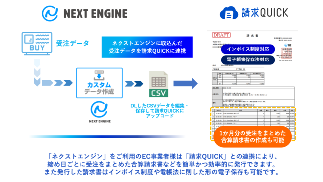 「ネクストエンジン」は、受発注業務の一元管理の一環として受注データを取り込んでカスタムデータを作成する機能を提供しています。このたびの「請求QUICK」との連携により、「ネクストエンジン」を利用するEC事業者は、CSVで受注データをダウンロードして編集・保存し、「請求QUICK」にアップロードすることで、月や締め日ごとの受注をまとめた合算請求書などを簡単かつ効率的に発行することができます。「請求QUICK」は、登録番号の記載や消費税計算といったインボイス制度の要件を満たした形の請求書発行と、改正電帳法に則した請求書控えの電子保存が可能なため、法対応の面でも安心してお使いいただけます。