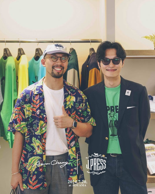 7月20日(土)のイベントはアーロン・チャン氏を迎え、コラボ商品の発売のほか、今回『J.PRESS』の為に書き下ろしたオリジナルの5柄、アーカイブ5柄の計10柄のポスターを販売し、購入いただいた方にはサイン会を予定しております。また、韓国イベントでも盛り上がりを見せたトークイベントや、商品をご購入いただいたお客様にはアーロン氏とのツーショットを撮影し、ブランドロゴネームをいれた写真を後日データでお渡しをするという企画も予定しております。
