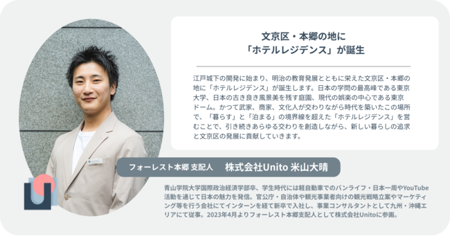 家具・インフラ完備、家賃は住んだ日数分だけのホテルレジデンス「unito」を運営する株式会社Unito(本社:東京都千代田区、代表取締役:近藤佑太朗、以下「ユニット」)は、2023年4月21日より、文部科学省共済組合が所有する宿泊所「フォーレスト本郷」をオープンします。 これにより、「フォーレスト本郷」は、ホテルとして宿泊はもちろん、家具・インフラ完備、家賃は住んだ日数分だけの“ホテルレジデンス”として、居住することも可能になりました。 東京ドームまで徒歩15分、東京メトロ南北線「東大前駅」徒歩5分、東京メトロ丸ノ内線・都営大江戸線「本郷三丁目駅」徒歩10分の好立地です。週に数回の出社日前や、東京ドームで開催される音楽ライブやプロ野球観戦をはじめとする推し活の際など、時々暮らす、必要最低限のものが揃う手軽な東京の住まいとして、ぜひご活用ください。 「フォーレスト本郷」公式サイト:https://forest-hongo.jp/