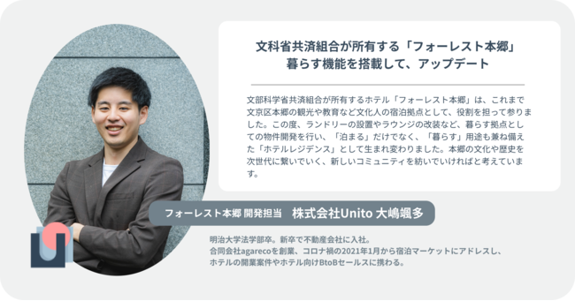 「フォーレスト本郷」は、東京大学のキャンパスから徒歩1分に位置し、東京都心へのアクセス至便でありながらも閑静な住宅街に囲まれています。 文部科学省共済組合の組合員様はもちろん、一般の方もご利用いただけます。 文部科学省共済組合 組合員様向け予約ページ:https://www.chillnn.com/1864a6ad0191fe/plan/18734fc18823d9 一般のお客様向け予約ページ:https://www.chillnn.com/1864a6ad0191fe/plan/1872733e5a3363 <施設概要> ・名 称:フォーレスト本郷 ・所 在 地:東京都文京区本郷6-16-4 ・アクセス:南北線「東大前駅」より徒歩5分、丸ノ内線・大江戸線「本郷三丁目駅」より徒歩10分 ・所 有 者:文部科学省共済組合 ・運 営 受 託 者:株式会社Unito ・部 屋 数:63部屋 ・専有面積:16~37平方メートル ・公式ホームページ:https://forest-hongo.jp/ <部屋> 部屋タイプは、全7タイプ。プレスリリースでは、一部のお部屋を紹介します。 スタンダードダブル