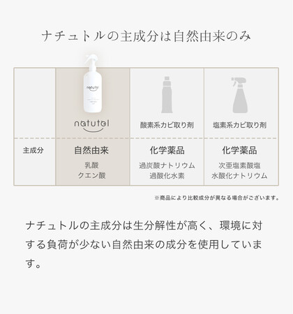natutolのカビ取り成分は自然由来の発酵乳酸を使用し、素肌と同じ弱酸性。
