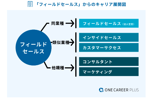 例えば、現在「フィールドセールス」をはじめとする営業職に従事している人は、クライアントそれぞれの課題に対する仮説構築、課題発見、関係構築、情報収集など、転用可能なスキルを習得することができます。現に、転職サイト「ONE CAREER PLUS」に投稿された転職体験談を見ると、フィールドセールスからマーケティング職へ転職したケース、コンサルタント職へ転職したケースなどがあります。