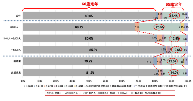 定年年齢の動向については、従業員規模が大きいほど65歳定年の割合が高くなる傾向が見られます。