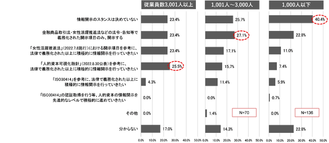人的資本経営を推進するための取組状況では、従業員規模による情報開示へのスタンスの違いに差がありました。