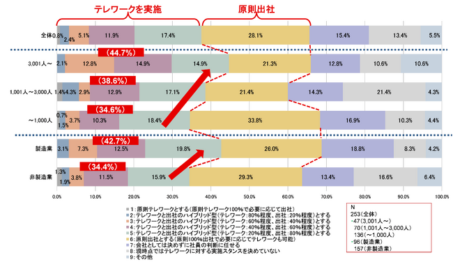 テレワークに対するスタンスでは、従業員数の多い企業ほど、「テレワークの実施割合」が高い傾向にありました。また、製造業42.7%、非製造業34.4%と業種によっても差があることが示されました。