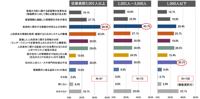 人的資本の情報開示を進める上での課題でも、従業員規模によるスタンスの違いが見られます。