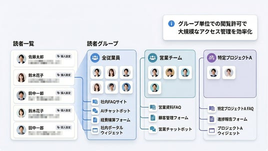 FAQサイトやAIチャットボットへのアクセス許可をグループ単位で一括設定し、組織拡大に伴う運用負荷を大幅に軽減
