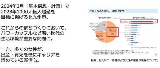 特に「若者や女性の定着や活躍について」の北九州市の調査によると、妊娠・出産・育児をきっかけとする退職を経験した女性が多く、共働きをしたい世帯にとっての暮らしの環境を改善することで、定着や移住を促進できる可能性があります。