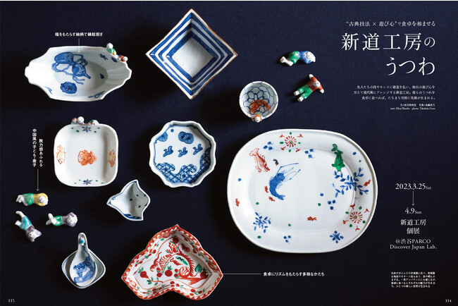 先人たちの技やセンスに敬意を払い、独自の遊び心を交えて現代風にアレンジする新道工房。愛知県瀬戸市で宮本茂利さん・智子さん夫妻によってつくられるうつわを食卓に並べれば、たちまち空間に笑顔が生まれます。小誌の直営店「Discover Japan Lab.」では、3月25日(土)~4月9日(日)に「新道工房 個展」を開催。千鳥やひょうたんなどの福を呼び込むモチーフから、中国風の子どもを模した唐子まで、普段使いしやすい作品と魅力を紹介しています。