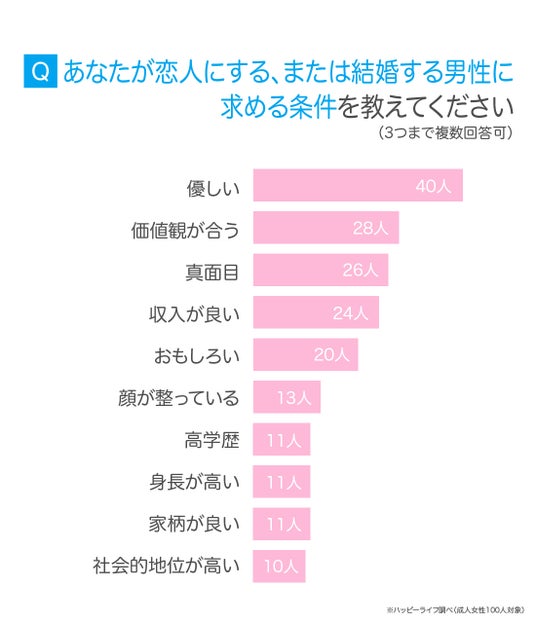 恋人・結婚相手に求める条件を聞いたところ、「優しい」が最多でした。
