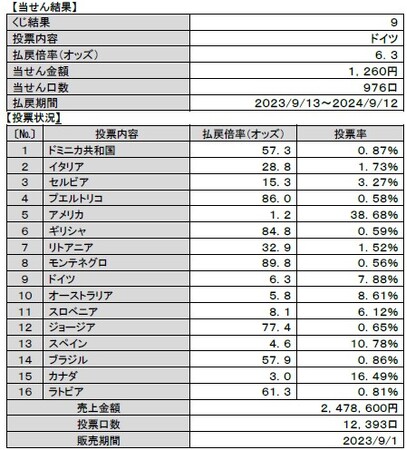 全16選択肢のうち最も多かった投票内容は、「アメリカ」の優勝、払戻倍率(オッズ)は1.2倍となった中、5番目に投票の多かった結果となりました。
