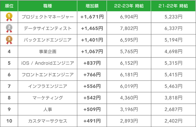 これらのデータを総合的に見ると、全体的に各職種の時給および年収が上昇しており、特にテクノロジーとデータ関連の職種(データサイエンティスト、エンジニア)や事業戦略を立案する職種(プロジェクトマネージャー、事業企画)の成長が目立つことが分かります。これらの職種が持つスキルや知識がますます重要になっていることを反映しています。