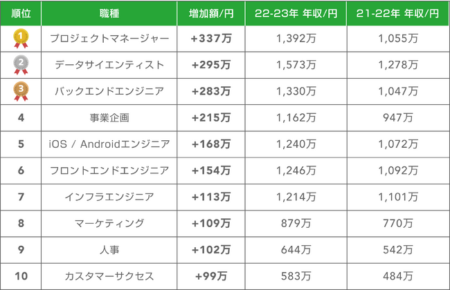 エンジニア(バックエンド、iOS / Android、フロントエンド、インフラ):全てのエンジニアの職種で年収が上昇しており、それぞれの職種での増加率は、バックエンドエンジニアで27%、iOS / Androidエンジニアで16%、フロントエンドエンジニアで14%、インフラエンジニアで10%です。この成長は、技術の進歩とデジタル変革の進行に伴い、これらの職種がますます重要になっていることを示しています。
