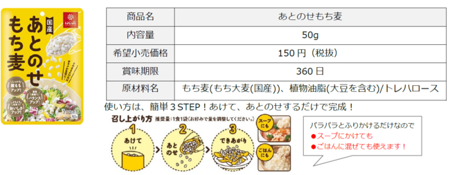 “調理済み”のもち麦で、サラダにあとのせするだけで、いつも食べているサラダが、からだもこころも元気になるサラダにアップグレード。サラダだけでなく、ごはんにまぜて、スープなどお好みの料理の具材としてもお楽しみいただけます。