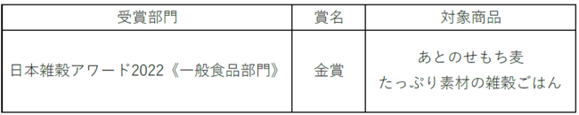 穀物のリーディングカンパニー株式会社はくばく(本社:山梨県中央市、代表取締役社長:長澤 重俊)は、一般社団法人日本雑穀協会が主催する「日本雑穀アワード2022《一般食品部門》」にて、『あとのせもち麦』『たっぷり素材の雑穀ごはん』の2品が“金賞”を受賞いたしました。