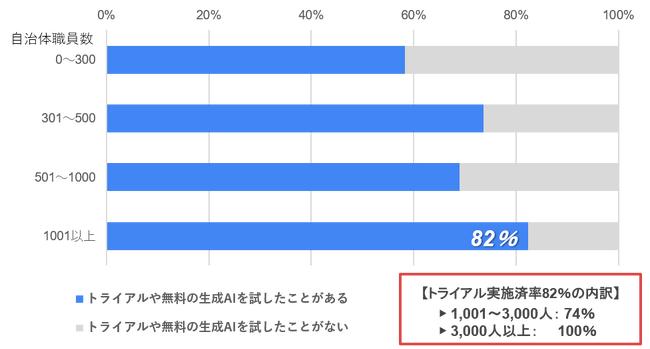 ・職員数1,001名以上の自治体は、82%がすでに何らかのトライアルを実施済み