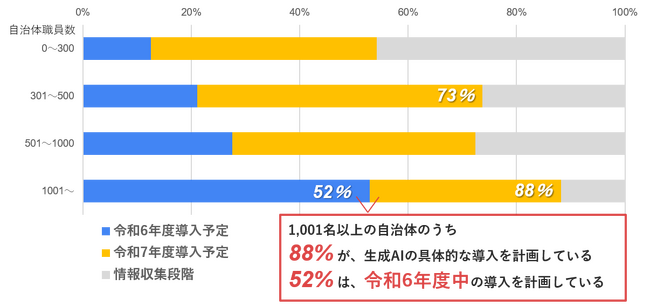 職員数1,001以上の自治体の半数以上は、令和6年度中に生成AI導入を計画しています。