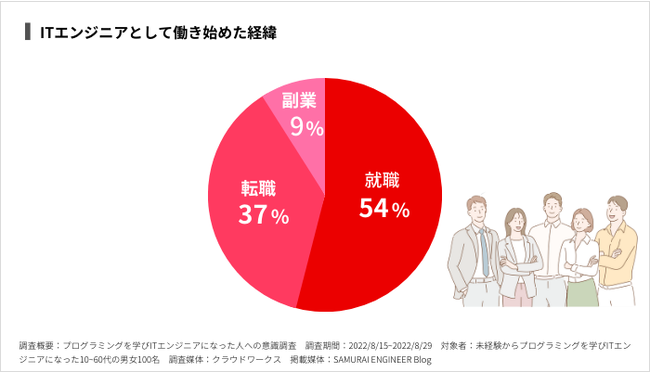 次に「ITエンジニアとして働き始めた経緯」を聞いたところ、「就職」が54%、「転職」が37%、「副業」が9%でした。
