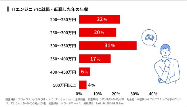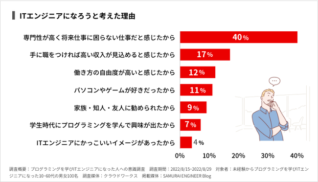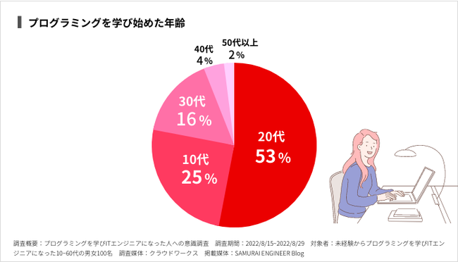 プログラミングスクール「SAMURAI ENGINEER」を運営する株式会社SAMURAI(本社所在地:東京都千代田区、代表取締役 :高比良 直人)は、未経験からプログラミングを学びITエンジニアになった10~60代の男女100名を対象とした意識調査の結果を発表いたします。