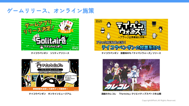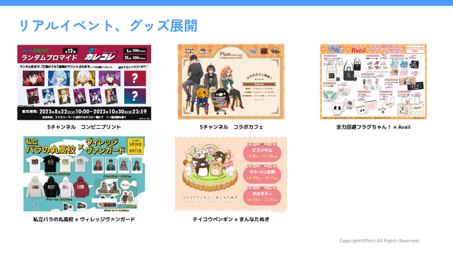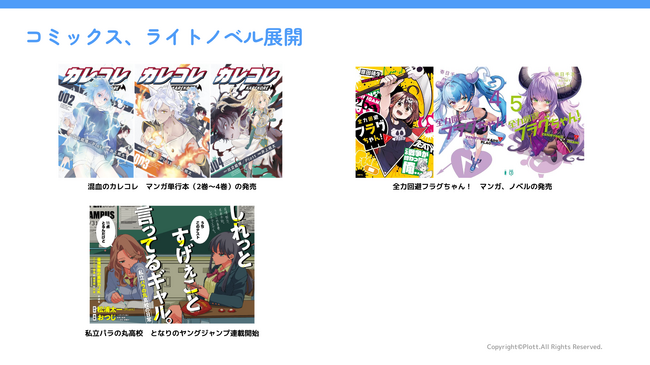 『混血のカレコレ』のマンガ単行本(2巻~4巻)の発売や、『全力回避フラグちゃん!』のローソンプリントコラボ、SMILE BASE CAFE(スマイルベースカフェ) とPlottアニメとのコラボカフェ (東京/大阪/愛知) やアニメイト一部店舗・アニメイト通販にて開催した『五月病を吹き飛ばす!Plottフェア inアニメイト」などコミカライズからリアルイベントまで幅広くメディアミックスを展開。2023年にリリースした『テイコウペンギン』のカジュアルゲーム「テイコウペンギンのソリティア」と「テイペンウォーズ~ブラック企業破壊大作戦~」も好評配信中です。