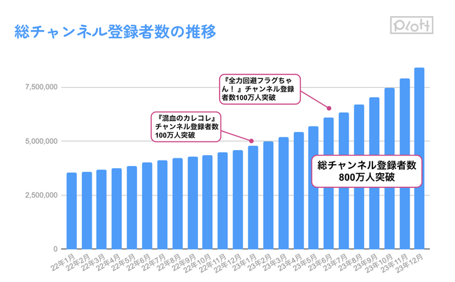 またPlottは2023年12月には累計チャンネル登録者数が800万人を突破。2021年1月から比べて4倍のファンダムへと成長しています。プラットフォームに最適化したIPコンテンツを制作、独自ノウハウに基づいたチャンネル運営をすることでメディアパワーを高めています。