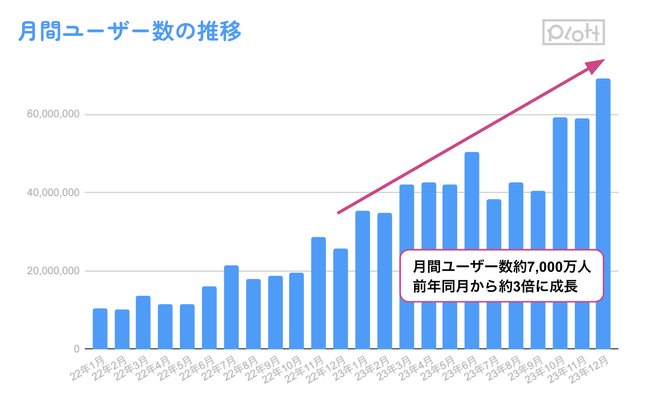 Plottが展開するチャンネルの月間ユーザー数は2023年12月時点で延べ約7,000万人(※)となり、昨年同月から比べると約3倍と急成長をしています。※Plottが運営する全チャンネルのUU数の合計(ユーザーの重複あり)