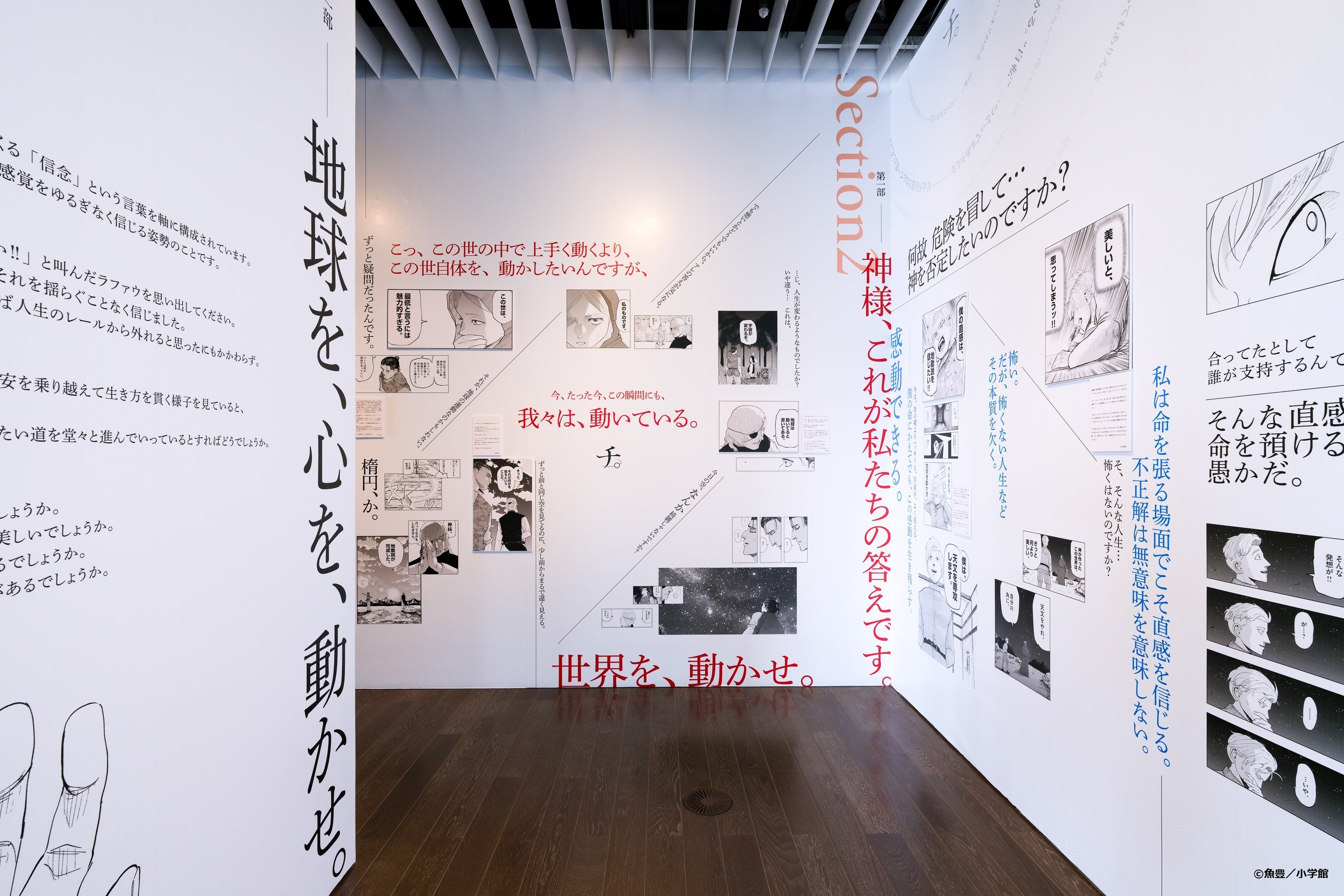 作中で登場する言葉やエピソード、登場人物の動きなどを哲学者、文筆家などが様々な視点で掘り下げた展示を行います。「“信念”とは」「“真理”とは」「あなたにとっての“信念”とは」という3つの展示テーマを軸に、哲学者・谷川嘉浩氏の監修にて、セリフやシーンをピックアップしました。谷川氏のほか、英文学者・小川公代氏、哲学者・下西風澄氏、文筆家・伊藤亜和氏の視点を通した『チ。』で語られた言葉が、来場者の思考をひらく“きっかけ”となるでしょう。