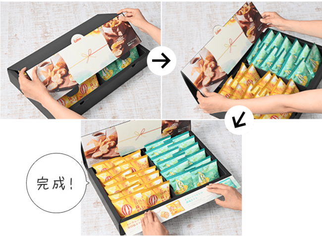 蓋を折り曲げるだけで簡単に組み立てられます。置き菓子タイプなのでオフィスでも喜ばれます。