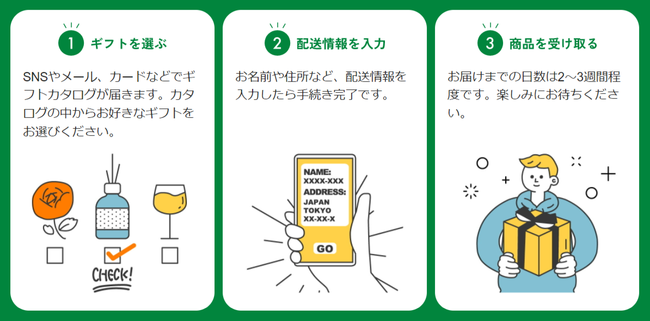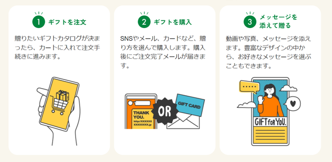 住所を知らなくても、SNSやメールで簡単にギフトを贈ることができる仕組みです。お互いの名前や住所は表示されないため、気軽にギフトを贈り合うことができます。動画やメッセージを添えることが出来るので、お祝いや感謝の気持ちを伝えるのにぴったりです。