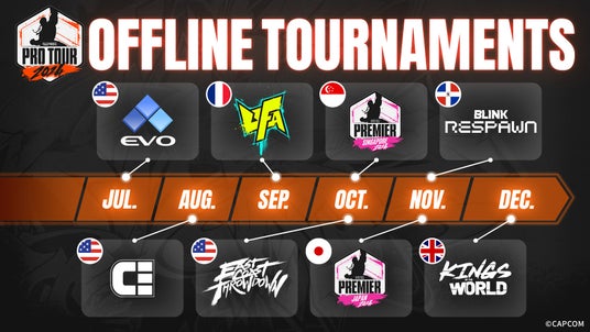 「CAPCOM Pro Tour 2024」で実施される8つのPREMIER(オフライン大会)のスケジュールおよび開催国。本大会は東アジアで開催される唯一のオフライン大会です。