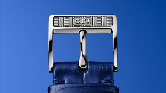 ゼニスの「G.F.J.」には、ダークブルーのアリゲーターレザーストラップ、ブラックのカーフレザーストラップ、ブルーの“サフィアーノ”カーフレザーストラップの3本が付属し、プラチナ製ピンバックルには「G.F.J.」のイニシャルとブリックパターンが刻まれています。また、センターリンクにブリックパターンのエンボスがあしらわれた7連のプラチナ製ブレスレットもオプションでご注文いただけます。